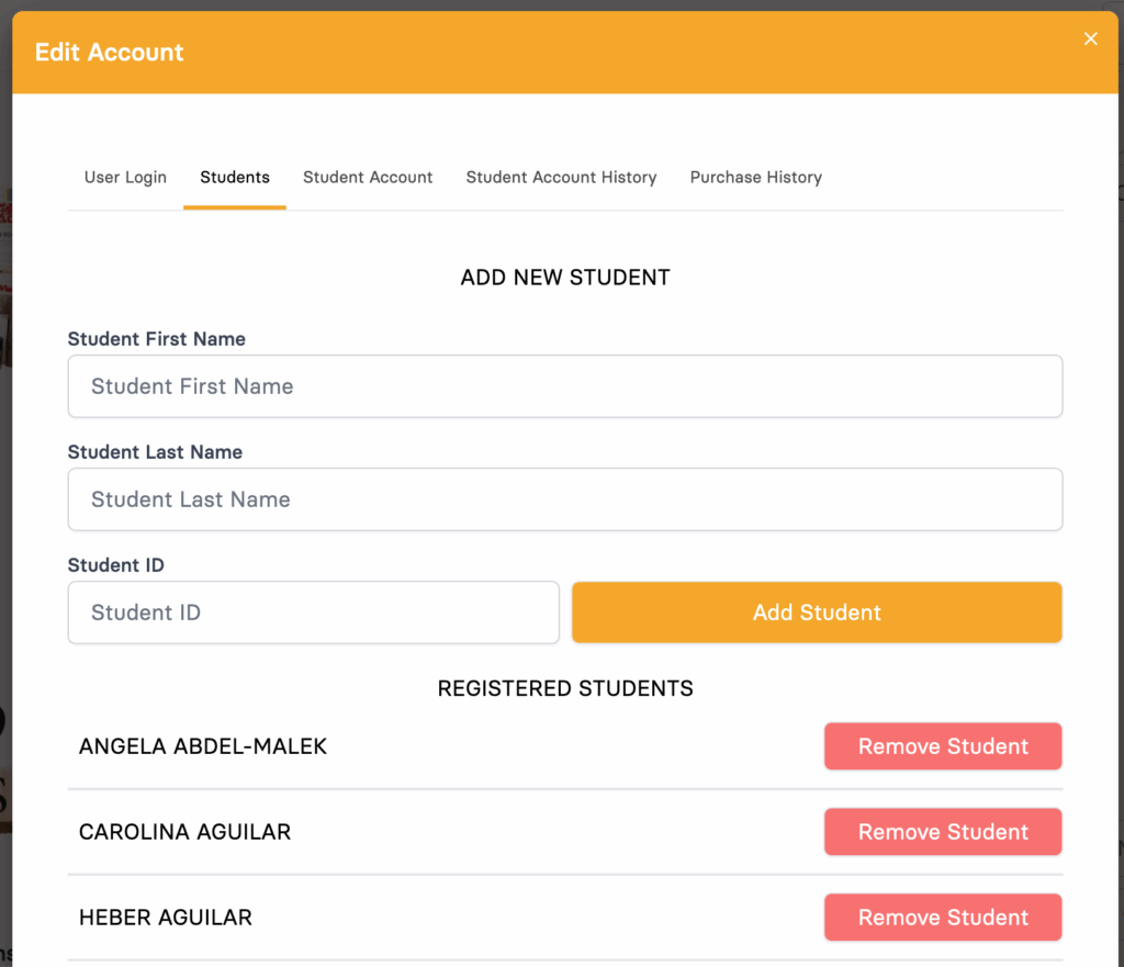 Add Student – To add a new student to your account, enter the first, last and student ID number. This has to be an exact match to what the school has on file. Click Add Student and they will show up on the list below.