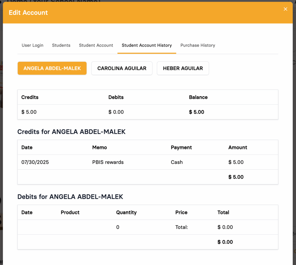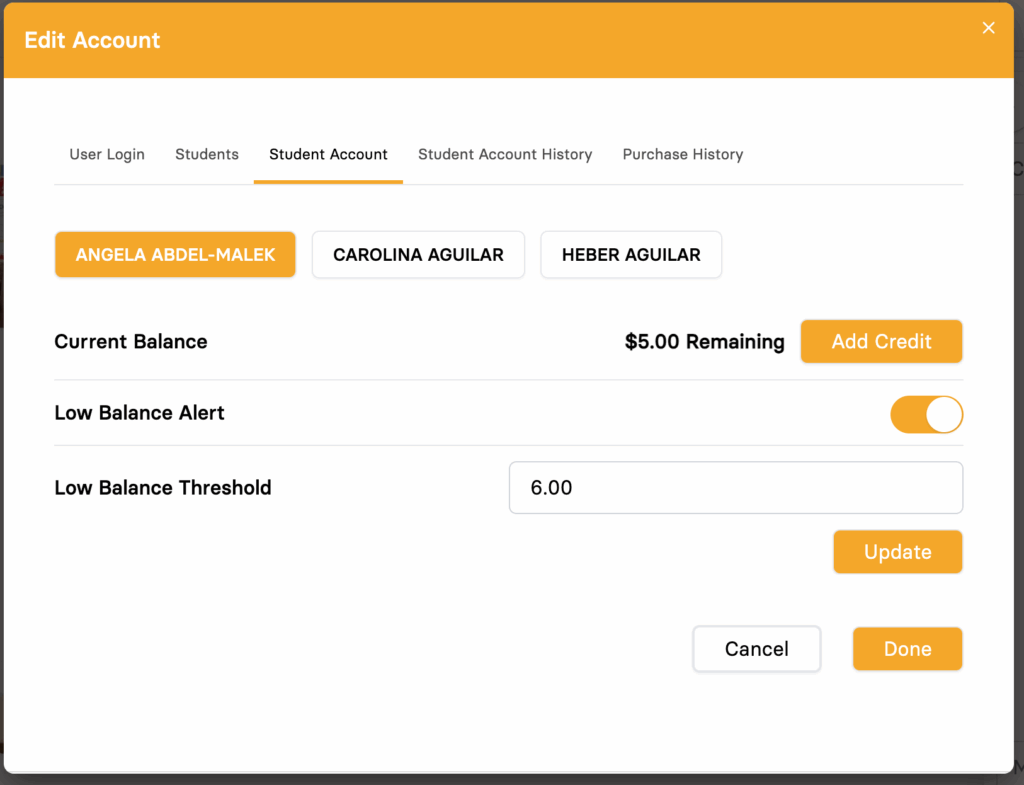Select Student – Each student can have his or her own settings. Click on each student to see the current balance as well as update the settings below. .